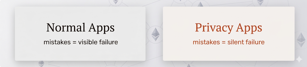 When making a private transaction today, using any of the existing privacy protocols, your transaction will not revert and you will receive that green checkmark. The interface looks fine. Funds arrive. However, there is no feedback loop on privacy. User's privacy could be gone, no second chance. That difference matters. A flow can work technically and still expose the user.